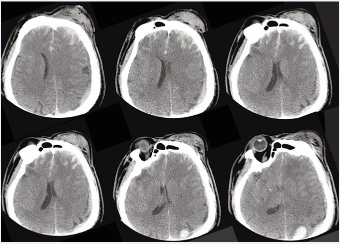 Figure 4 Admission head CT (axial slices) Representative axial images demonstrating parenchymal injury and edema in the acute phase of TBI.