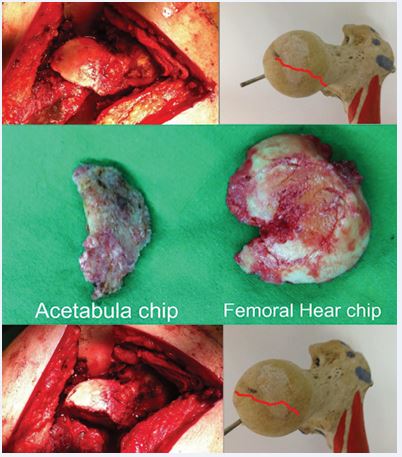 Figure 5 Intra-operative views and retrieved fragments Watson–Jones exposure with removal of acetabular rim and femoral head fragments; bone model outlines the fracture line orientation.