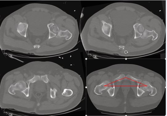 Figure 7 Axial pelvic CT for pre-operative planning Axial reconstructions across the hip joint; bottom-right panel includes a red overlay illustrating the acetabular roof contour/orientation used for planning.