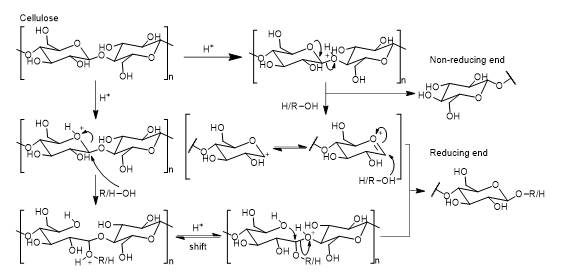 Cellulose hydrolysis follows two possible mechanisms. One is the closed chain path and other is the opened chain path. In the closed chain path the oxonium formed expresses a strong electrophilic character. It is believed that the alcohol hydroxy group acts as a nucleophile consequently leading to the formation of glycosides. In the opened chain path, the protonation of the ring oxygen leads to an increased electrophilicity of the C-1. This is consequently followed by a nucleophilic attack from the hydroxy group on C-1. These two mechanisms have been studied through the stability of methyl glycosides and evidence has pointed to the higher stability of the oxonium intermediate [25].
