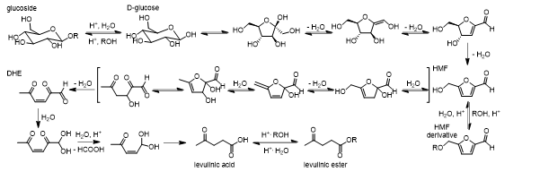 Figure 3: Decomposition mechanism of glycoside to HMF, HMF derivative, levulinic acid and levulinic ester.