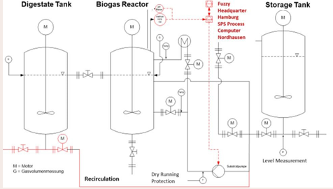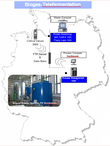 First, an overview of the remote monitoring and internet based Fuzzy logic feedback control system will be given. Process data of the biogas plant of the University of Appled Sciences in Nordhausen (Thuringia) were collected with the help of remote monitoring, saved and transferred online to the HAW in Hamburg, district Bergedorf. A rapid response and process adaptation should be guaranteed by a separate internet account (Figure 1).