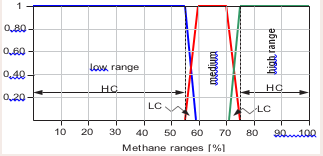 Figure 3: Scheme of the developed and implemented Fuzzy rules on the Fuzzy tool of the used LABVIEW ® software demonstrating the adjustment of control ranges for the FLC directed substrate feeding. The measured methane (CH4) percentage in the produced biogas was related as shown to the three ranges of low, medium and high (HC, LC = high or low concentration). The medium control range (MR) for CH4 percentage was 60–70%. The HC range was found experimentally to be above 75% and below 60% of methane. The LC range is a transient status between HC and MR. In the case of methane content, the HC value is not experimentally achievable, e.g. it means a high content above 75%.