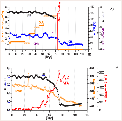 Figure 5: Test period I. Intermittent, successive feeding of the 1 m³ biogas reactor with bruised barley grains as substrate and mono-input.Recorded are the following control parameters: pH, added OLR, volumetric GPR [m3] and the methane content of the produced biogas. The provoked reactor overloading could be seen by the pH signal already on day 55-65. B) Test period I. The same reactor with intermittent, successive feeding of bruised barley grains as substrate and mono-input. Pictured are the parameters pH, redox resp. ORP and the volatile fatty acids (VFA). Increasing the OLR to 6.3 kgVS/(m3 d) led to a high increase of 25,000 mg/L VFA and decrease of pH. Feeding was stopped on day 74 to normalize the VFA level.