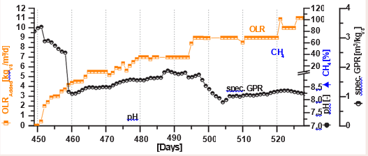 Figure 6: Test period II. The implemented, automatic Fuzzy logic feedback control was tested over a period of 736 trial days. Automatic substrate feeding of the 1 m3 fermenter 3x/d with a pump controlled by Fuzzy logics and the Fuzzy rules of Fig. 2, 3. Pictured are the days 449-528 with the control parameters pH, methane content [%] of the produced biogas, specific GPR [m3/kgVS] and the OLRAdded kgVS/(m3d). The diagram shows the given increase of OLR from 2 to 9 kgVS/(m3d) under the direction of automatic Fuzzy logic feedback control.