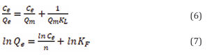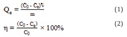 0.03g dried SA/Nd gel balls were added into a series of 50 mL conical bottles, and then 25mL direct dye solution with a certain concentration was added respectively. The samples were oscillated in a 298k constant temperature water bath for 120 min, and then filtered with a water filter membrane with a pore size of 0.45µm. The absorbance A of the solution after gel ball removal was measured at the maximum wavelength λmax of each dye by absorbance spectrophotometry, and the equilibrium adsorption capacity Qe(mg/g) and removal rate ?(%) of the SA/Nd gel ball adsorption material for the two direct dyes were calculated by formulas (1) and (2), respectively.
