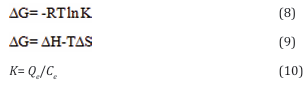 Where R represents the gas constant with a value of 8.314 J/mol/K and T is the temperature in Kelvin. The equilibrium constant K can be calculated by applying Eq. 11.