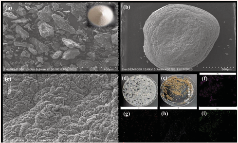 Figure 3: SEM images of SA (a), SA/Nd (b, c); Photograph of wet gel spheres (d) dried gel spheres (e) and distribution of each element of SA/Nd (Na(f), C(g), N(h), Nd(i))