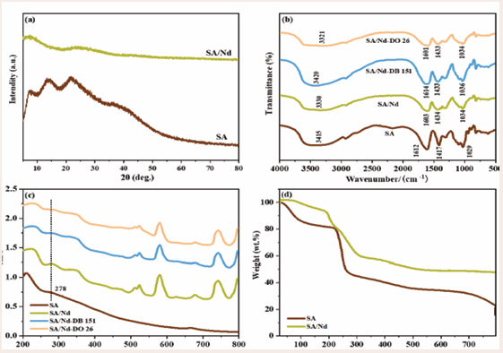 Figure 4: XRD patterns (a) of SA, SA/Nd; FTIR spectra (b) and UV-Vis DRS (c) of SA, SA/Nd and SA/Nd gel spheres after adsorption of DB 151 and DO 26 dyes; TGA profile (d) of SA, SA/Nd