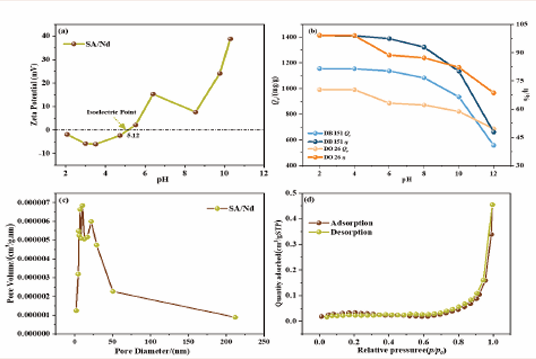 Figure 5: Zeta potential of SA/Nd at different pH values (a); effect of pH on the adsorption performance of SA/Nd (b); pore size distribution (c); adsorption-desorption isotherm (d)