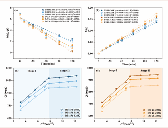 Figure 6: Fitted curves of the proposed primary(a) and secondary kinetics(b) and intra-particle diffusion model(c-d) for the SA/Nd adsorption process