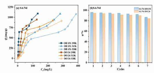 By comparing the adsorption properties of DB 151 and DO 26 by different adsorption materials (Table 6), it was found that the adsorption properties of SA/Nd were significantly better than those of other adsorption materials, and the preparation process of SA/Nd was simple, the performance was stable, the recycling performance was good, and the adsorption properties were biofriendly.