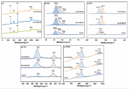 In order to further investigate the adsorption mechanism of SA/Nd on the two azo dyes, SA/Nd before and after the adsorption of the dyes were analyzed by FT IR (Figure 4(b)), UV-Vis (Figure 4(c)) and XPS (Figure 8).