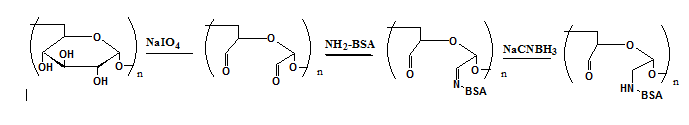 Dextran-BSA antigen was synthesis by periodate oxidation of dextran (T10, T40, T100, T2000), then conjugated with amino groups of BSA and finally reduced by sodium cyanoborohydride. Different aspects on reaction condition were studied as follow.