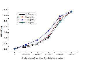 Optimization of the coating concentration: The dextran– BSA antigen (e.g. T40, Dex/NaIO4 ratio of 1/120) was prepared as coating buffer at different concentrations of 2.5, 5, 10 and 20 μg mL-1, respectively and combined with dextran T40 polyclonal antibody for multiple proportion dilution Elisa analysis. According to immunoassay analysis mentioned above, the absorbance at 450 nm was monitored and shown in figure 10.