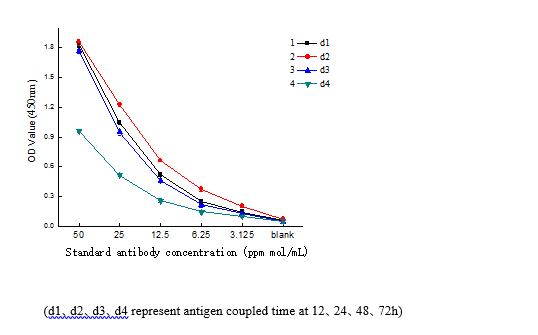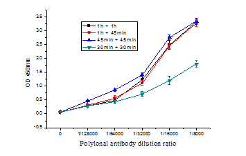 The result showed that the OD450 was most sensitive when the blocked coating antigen was incubated with either polyclonal antibody or enzyme-labeled antibody for 45min.