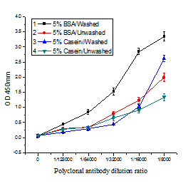 Optimization of the blocking solvent: Two kinds of blocking solvent were investigated, including 5% BSA protein and 5% casein protein, the effect of washed and unwashed the plate was also studied. The results were demonstrated in Figure 12