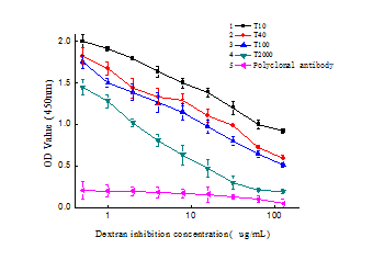 The working curve shown different molecular dextran can be detected by T40 dex-BSA polyclonal antibody using Elisa detection. The higher dextran molecular gain the more sensitive the detection reached. From the cross-reactivity data, different molecular dextran hindered the Elisa detection of dextran T40. Dextran with similar molecular with dextran T40 had prominent effect. In consideration of dextran had similar structure, the developed method can be used for total dextran determination in practical samples.