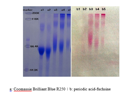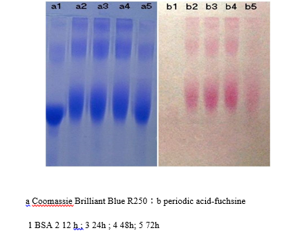 It was found that the yield reached maximum at 24 h and kept a plateau, and the neoglycoprotein reduced at 72h. The degree of grafting (DG) was increased gradually, which was not consistent with the results observed on SDS-PAGE (Figure 6).