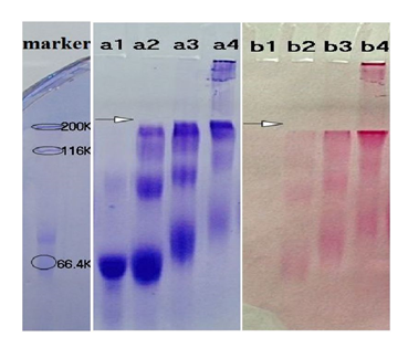 SDS-PAGE characterization: The resultant dextran–BSA conjugates were analyzed using the SDS-Polyacrylamide gel electrophoresis (SDS-PAGE) technique to confirm the presence of neoglycoprotein antigens. SDS-PAGE was performed according to the method of Laemmli [16] using 7.5% acrylamide as separating gel and 3% stacking gel containing 0.1% SDS. The protein and neoglycoproteins were prepared in a 0.08 M Tris-HCl buffer at pH 6.8 containing 4% SDS and 0.5% mercaptoethanol. Electrophoresis was carried out at a constant voltage of 80 V for 4 h. The gel sheets were stained with 0.2% Coomassie brillant blue R-250 for protein or with 0.4% periodate-fuchsin solution containing 0.2% basic fuchsin for neoglycoproteins conjugates [17]. A Nikon digital camera was used to obtain photographs.