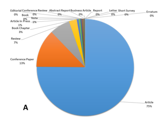 The survey also showed that maximum publication (more than 75% of total publication) on biogas are published as articles, and more than 12% are published as conference papers (Figure 3A).