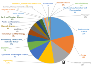 The majority of research on biogas is focused on Environmental Science (21%), Energy (14%), Chemical Engineering (12%) and Engineering (12%) (Figure 3B).