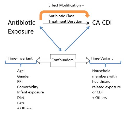 Figure 1: Antibiotic exposure and subsequent risk of CA-CDI accounting for potential confounders and effect modification.