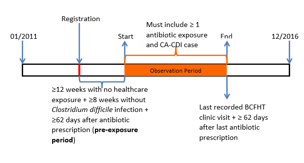 The BCFHT database will be the source of all patient data. The data collection will be limited to January 1, 2011 to December 31, 2016. Healthcare exposure will be determined by linking the BCFHT database to the Royal Victoria Hospital (RVH) database. The RVH is the sole hospital in Barrie, Ontario, and is assumed to be the primary site of acute healthcare for all the BCFHT patients. The observation period is not fixed, but will be determined by the period of patient registration with the BCFHT, along with healthcare exposureand Clostridium difficile infection (Figure 2).