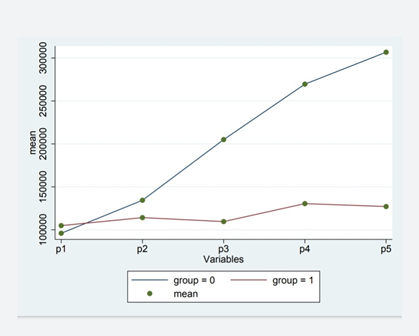Figure 1: Diagram of determining the effects of time, intervention and on the interaction of time and intervention platelet count (P1: before intervention, P2: 1 month after intervention, P3: 2 months after intervention, P4, 3 months after intervention, P5: 4 months after intervention.
