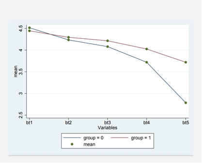 Figure 2: Diagram of determining the effects of time, intervention and on the interaction of time and BT intervention. (bt1: before intervention, bt2: 1 month after intervention, bt3: 2 months after intervention, bt4, 3 months after intervention, P5: 4 months after intervention.
