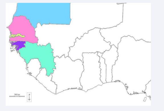 Figure 1: Map showing the five West African countries included in our study: Senegal (pink), Guinea (Green), Mauritania (blue), Guinea Bissau (Purple) and Gambia (yellow).