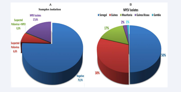 Primary stools from AFP cases were treated using chloroform and stool suspensions were inoculated in both RD and human poliovirus receptor CD155 expressing recombinant murine (L20B) cell lines. For samples showing no Cytopathic Effect (CPE) after 5 days, a second passage in the same cell line was done and cells were monitored for CPE during the next 5 days. Samples with no CPE in both cell lines, even after the blind passage, were considered negative whereas, L20B-positive isolates were classified as suspected poliovirus and subjected them to the intratypic differentiation. Only supernatants producing CPE in RD cells and not in L20B cells were considered as Non-Polio Enteroviruses (NPEV). These RD-positive supernatants were then harvested and kept frozen (-200C) until use. Overall, NPEV were isolated in 422 stool samples (18.10%) and the highest of were found in Senegal with (49.5%; N = 209).