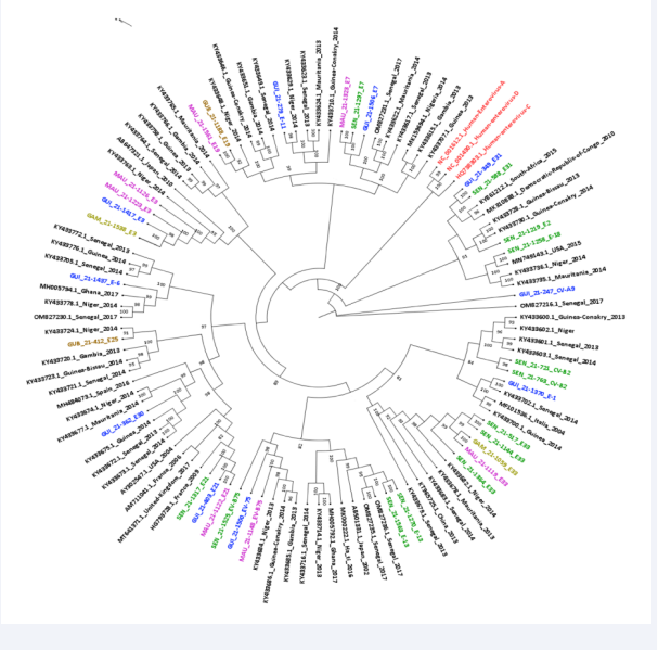 Figure 6: Phylogenetic tree of EVB isolates identified in AFP cases surveillance programs West Africa, 2021 from 107 partial VP1 sequences (~800 bp) including sequences available from GenBank (black), 3 reference sequences belonging to the 3 human enterovirus species (red), 13 from Senegal (green), 10 from Guinea (blue), 7 from Mauritania (pink), 2 from Guinea Bissau (Brown) and 2 from Gambia (yellow). Bootstrap values ≥80 are shown on the tree that was rooted on midpoints
