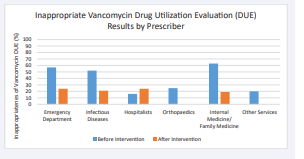 Results: After the intervention, there was a decrease in inappropriate prescribing from 48% to 22% of patients (p < 0.001), and a decrease in inappropriate days-on-therapy from 37% to 18% (p < 0.001). These improvements were due mainly to decreased prescribing of first dose, empiric use, in the Emergency Department (ED). No change was seen in clinical diagnosis, correctness of weight-based dosing, patient outcomes, or the rationale for vancomycin use. Common misconceptions amongst prescribers contributed to the overprescribing of vancomycin: (1) routinely adding vancomycin for empiric treatment of sepsis without risk factors for MRSA; (2) the false perception that vancomycin is necessary to “cover” various species of streptococci; (3) the need to treat a single positive blood culture growing coagulase-negative staphylococci; and (4) imprecision in assigning a diagnosis of “penicillin allergy”.