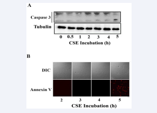 The existing literature shows that autophagosome accumulation is cytotoxic to cells and can serve as a platform for activating apoptotic or necrotic pathways [28]. Therefore, at 5 h, apoptosis was verified by looking into the presence of cleaved caspase 3 in western blot, and also immunofluorescence was performed for annexin V. Consistent with the expectation, Figure 4 showed the presence of cleaved caspase 3 only at 5 h and also the cells that were treated with CSE for 5 h exhibited annexin V staining. Taken together, the results showed that in the second phase of autophagy, autophagosomes do not get fused with lysosomes and thus accumulate. This, in turn, induces apoptosis and cellular death (Figure 3A,3B)