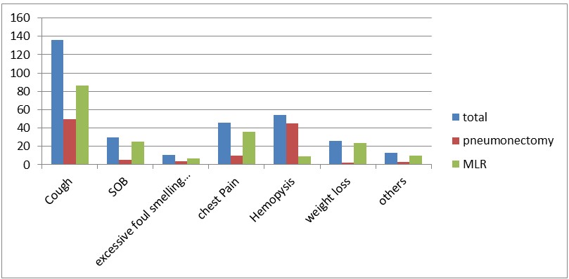 About 80.4% (45) of the pneumonectomy and 92.7% (115) of the MLR groups admitted on elective bases while 19.6% (11) of the case and 7.3% (9) of the control groups with p value of 0.01, are admitted on emergency but operated on elective bases after the patient stabilized. In 67.9% (38) of the pneumonectomy and 71.8% (89) of the MLR group the duration of the symptom is 6weeks and less whereas 32.1% (18) of the pneumonectomy and 28.2 %( 35) of the MLR group the duration of presenting symptoms is above 6 weeks. Also, 92.9% (52) of the pneumonectomy and 96.8% (120) of the MLR group has no history of smoking whereas 7.1% (4) of the pneumonectomy and 3.2% (4) 0f the MLR has history of cigarette smoking.