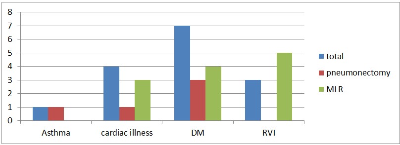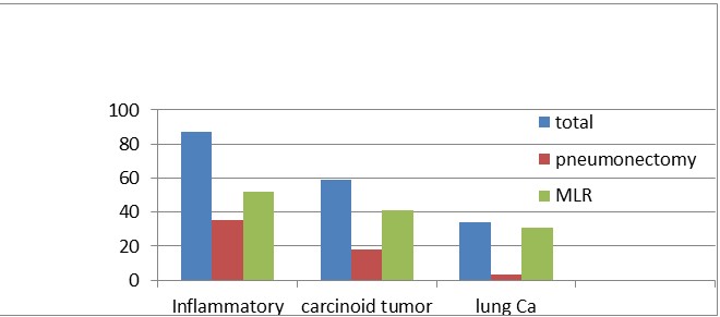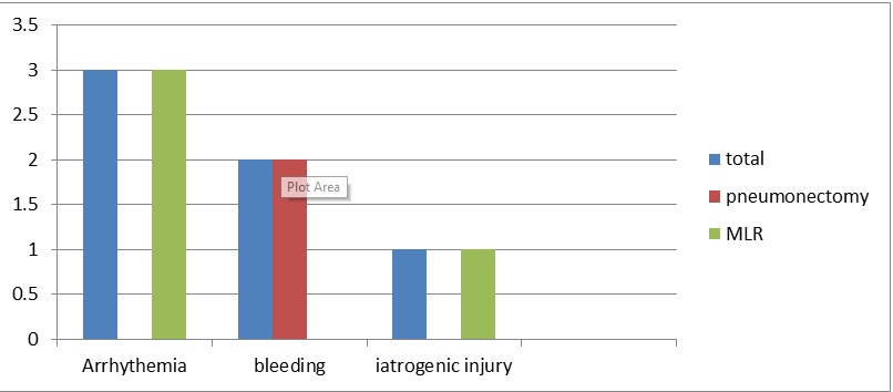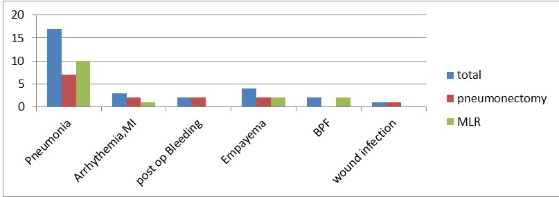 The complications of pneumonectomy in our study shows pneumonia 12.5%, arrhythmia 3.6%, post op bleeding 3.6%, Empyema 3.6% and wound infection 1.8% whereas arrhythmia 0.8%, BPF 1.6%, empyema 1.6% and pneumonia 8.1% are post op complications in MLR patients. In study from University of Natan medical school(2000) shows morbidity rate of 23% closer to this study and Empyema(14.8), bleeding (1.9), BPF (1.9) and wound sepsis (0.6) whereas study from Baghdad shows arrhythmia and atelectasis 40% and UK 19.9% in pneumonectomy is which higher than our study [1-28].
