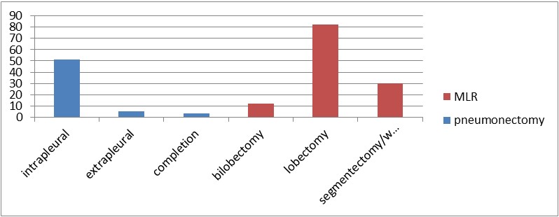Results: The majority of patients are in the age range of 20-30s, 27 (48.2%) for the pneumonectomy and 41 (33.1%) for the MLR with male to female ration of 1.6:1 and 1.3:1 in pneumonectomy and MLR respectively. 62.5% (35) of the pneumonectomy and 41.9% (52) of the MLR the patient operated for inflammatory conditions while 32.1% (18) of the pneumonectomy and 33.1% (41) of the MLR Carcinoid tumor is the surgical indication whereas Lung Ca is the diagnosis for 5.4% (3) of pneumonectomy and 25.0% (31) for MLR. Emergency admission (AOR, 3.43; 95%CI: 1.28, 8.67), Tb treatment history (AOR, 40.3; 95%CI: 3.01, 540.2), intra operative blood loss > 500ml (AOR, 9.07; 95%CI: 1.04, 79.13), and post-operative complication (AOR, 37.9; 95%CI: 1.82, 792) were identified as associated factors with pneumonectomy. The postoperative complication rate is 25% and 12.1% in pneumonectomy and MLR respectively whereas the mortality is 5.4% and 2.4% in pneumonectomy and MLR respectively.