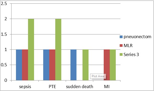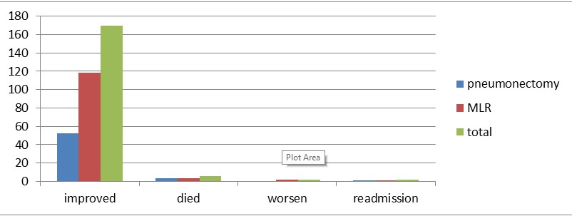 The majority, 92.9% (52) of the pneumonectomy and 95.2% (118) of the MLR discharged improved while 5.4% (3) of the pneumonectomy and 2.4% (3) of the MLR died whereas 1.6% (2) of the MLR worsen from admission time whereas 1.8% (1) of the pneumonectomy and 0.8% (1) of the MLR group readmitted within one month duration (Figure 7). Among the death, Sepsis 33.3% (1), PTE 33.3% (1) in both groups and sudden death 33.1% (1) in pneumonectomy and MI 33.1% (1) in MLR group is the probable cause of death (Figure 8).