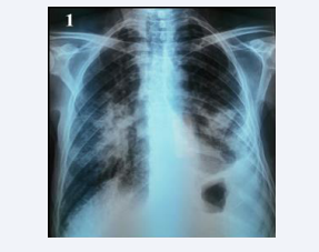 Figure 3: Standard frontal chest X-ray showing bilateral heterogeneous pseudotumour opacities with an appearance of left pleural effusion. Pleural puncture and biopsy revealed tuberculous pleurisy.