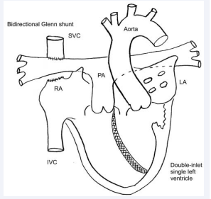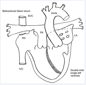 palliated with pulmonary artery banding at 3 months of age, and subsequent bidirectional Glenn at 10 months of age. At age 22 months, he underwent septation of his double inlet single left ventricle and pulmonary arterioplasty rather than complete Fontan cavo pulmonary reconstruction (Figure 2).