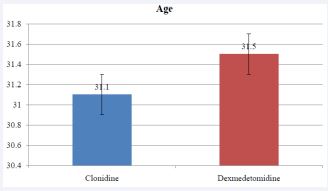 Mean age of subjects in Clonidine group was 31.1 ± 11.3 years and in Dexmedetomidine group was 31.5 ± 10.2 years. There was no significant difference in age distribution between two groups.