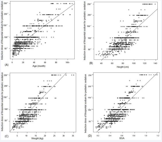 Conclusions: Not only weight but also age, height, and BSA should be considered for determining the induction dose of thiopental sodium for pediatric sedation by using the proposed regression equation. However, further clinical research should be performed to validate the equation.