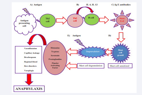 Both mechanisms result in tissue mast cells, and it causes the release of chemical mediators that initiate anaphylactic reactions from basophils. The IgE-mediated mechanism, the first encounter with antigen/allergen macrophage-initiated process IgE by the range of B-cells while providing the formation of IgE, basophil, and mast they start sensitization by binding on their cells, binds to the antigen on the second encounter with the antigen from these previously sensitized cells by binding of two IgE molecules to basophil and mast cells [8-14]. Releasing chemical mediators, mainly histamine, leukotrienes (LTC4, LTD4, LTE4), inflammatory cells release many mediators, bradykinin, nitric oxide, and platelet-activating factor (PAF) [8]. The clinical consequences of anaphylactic reactions occur with the release of these mediators. The acute shock that develops during anaphylaxis is classically known as disruptive shock. This table originated from the effects of vasoactive mediators on the cardiopulmonary system associated with profound hypovolemia. Vasoplegia and shock cause many physiological changes with the effect of inflammatory mediators released [8,10]. These results: