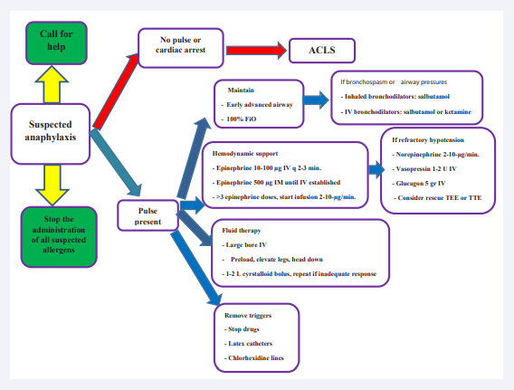 PA is a fatal clinical condition that requires immediate aggressive, effective, and accurate intervention in a multidisciplinary manner when its diagnosis is suspected. The first thing to do is discontinue the suspected triggering agent and emergency resuscitation measures, including administration of 100% oxygen, establishing a decisive airway, epinephrine, and adequate fluid resuscitation (It should be initiated according to the Advanced Cardiovascular Life Support guidelines (ACLS) [22-24]. To correctly manage the emergency when PA develops under general anesthesia, calling for early help is a known step in treating hemodynamically unstable patients. It is crucial to apply resuscitation according to the guideline. First, IV administration of epinephrine, followed by fluid resuscitation and appropriate administration of other treatments, is essential. The rapid management of PA is summarised in Figure 2 [23,24].