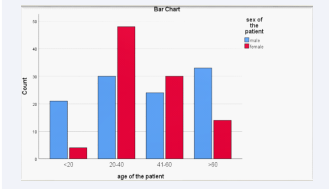 Figure 1: Bar graph of age and sex of rate of cancellation at Debre Markos Comprehensive Specialized Hospital, Debre Markos, Ethiopia, 2022GC. General surgery had the highest number, 100 (49.0%) of cancelled cases, however, ENT surgery had the lowest 2 (1.0%) cancellation rate in DMCSH (Table 2).