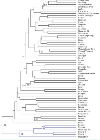 Distance-based multivariate analysis was used to assess the relationship among the individual abaca samples, as well as their relationships with reference samples from the USDA Musa germplasm collection. Pairwise genetic distances were computed using the Distance option and Principal Coordinates Analysis (PCoA), based on the pairwise distance matrix were measured using the GenAlEx 6.5 program [30,31]. Both distance and covariance were standardized. In addition, a cluster analysis using the UPGMA (unweight pair group method with arithmetic mean) method was performed to further examine the genetic relationship among the 62 abaca accessions. First, the distance between individuals was calculated with 100 bootstrapping using the shared proportion of alleles distance measurement in the program Microsatellite Analyser [32]. The resulting distance matrix was used to generate a consensus dendrogram using the program PHYLIP [33]. Thereafter, the dendrogram was visualized using the FigTree program version 1.3.1 [34].