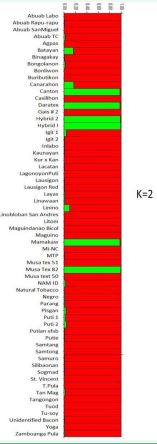 As part of the PhilFIDA’s project, abaca germplasm is being characterized phenotypically. However, the phenotypic characteristics appear to be influenced by environmental conditions and geographic location where they are grown. Evolutionary processes driven by environment factors that are influenced by geographical and physical differences have caused changes in some morphological characteristics but the genotype remains unchanged [16]. Moreover, the environmental effects on phenotypic traits can be confused by somaclonal mutations, which have been commonly reported in vegetative propagated crops, including other Musa species. Subsequently, both molecular and phenotypic characterizations are needed to accurately identify abaca genetic resources in both genebanks and farmer’s fields [8].