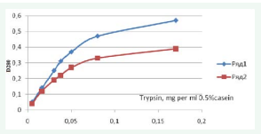 Figure 6 Digestion of casein by trypsin Optical density at 280 nm plotted vs. milligrams of trypsin (1-digestion of casein by trypsin, 2–digestion of casein by trypsin with equivalent amount of chickpea trypsin inhibitor)