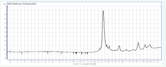 The LC/MS analysis results of this fraction (Figure 2) were indicated that this fraction contains a six proteins with molecular weight 11440.9 Da that appear at 13.21 min, a proteins with molecular weight of 26032.49 Da that appear at 13.55 min, a protein with proteins molecular weight of 26016.34 Da that appear at 13.69 min, a protein molecular weight of 28822.02 Da that appear at 14.24 min and a protein 11079.57 Da, 16619.09 Da that appear at 14.56 min.